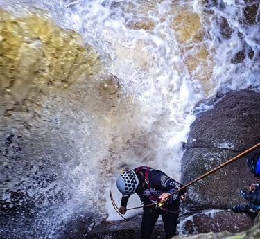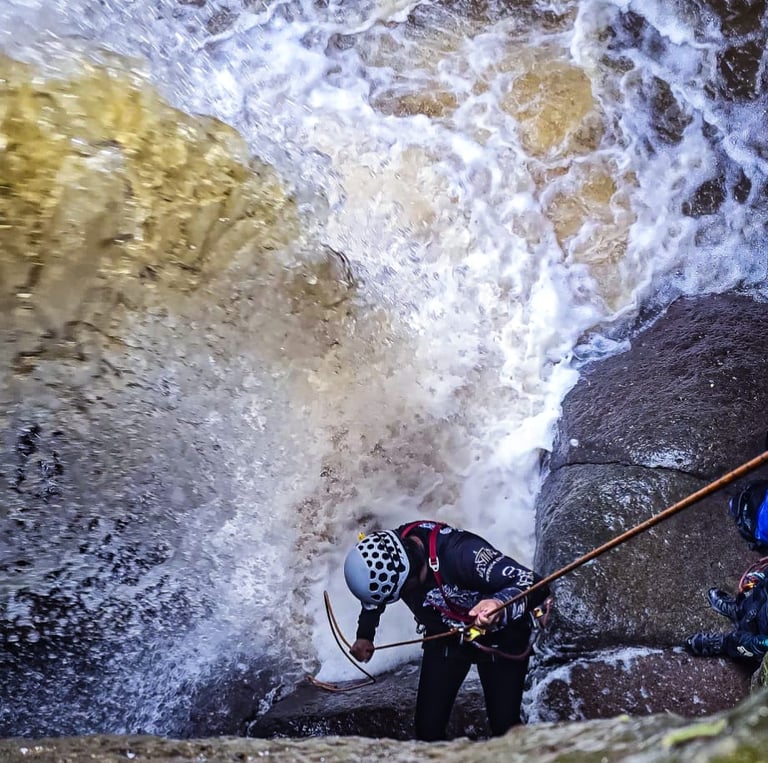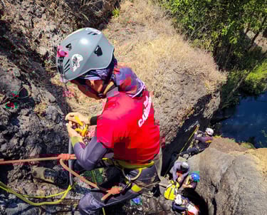 Formación técnica para descender cañones con seguridad, evaluando riesgos y aplicando protocolos de emergencia.